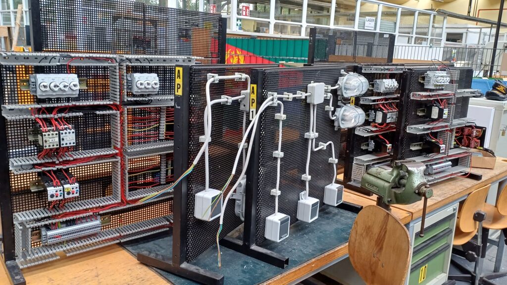 • Praktischer Aufbau auf Montagelochblechen von Schaltungen der Gebäudetechnik (Aus-, Wechsel-, Kreuz- und Treppenhausschaltungen) sowie einfacher Steuerungen von Motoren.